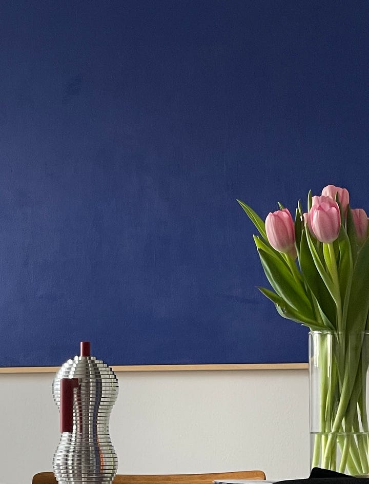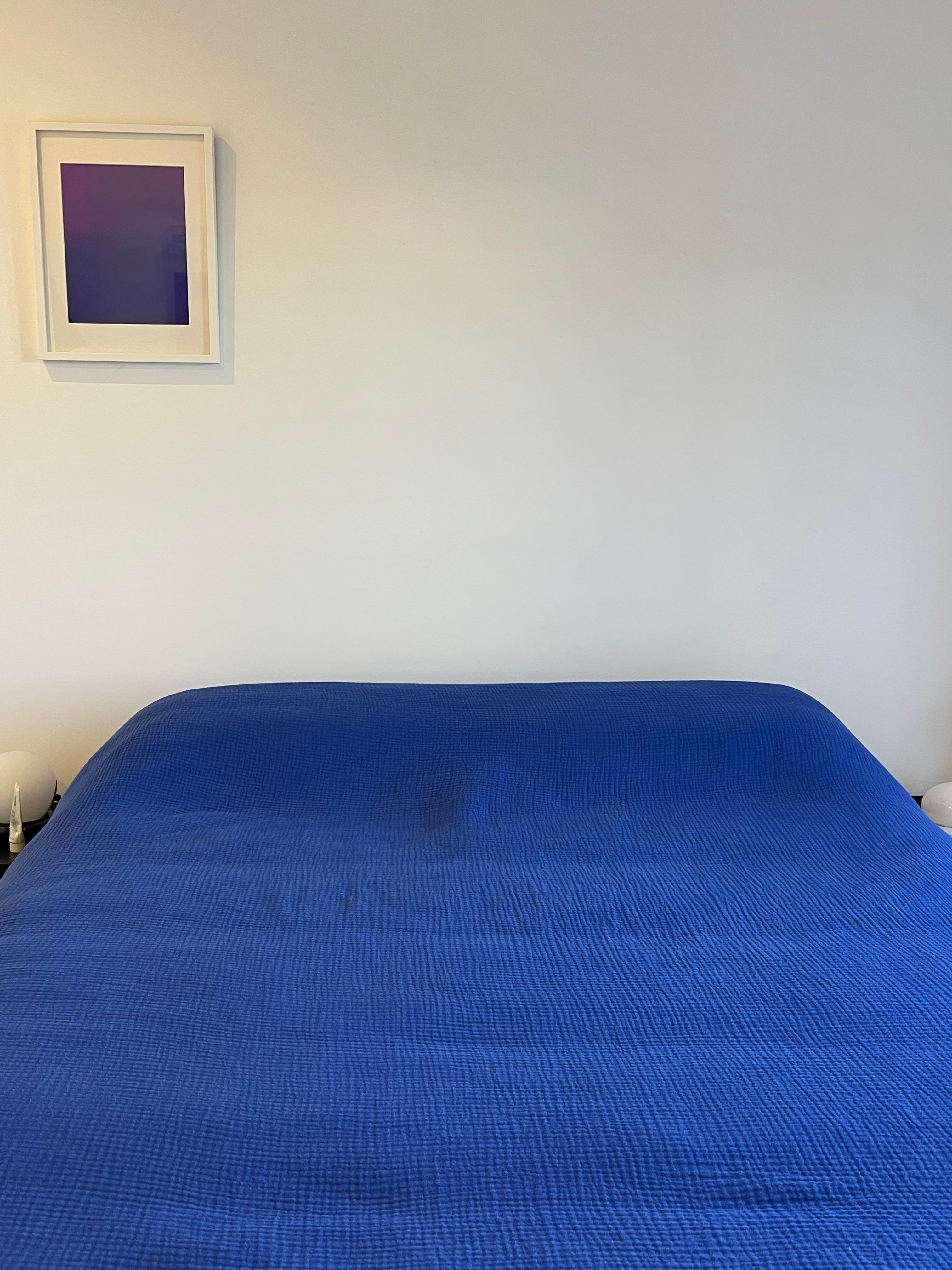 In my own home, I have two pops of royal blue, one of my favourite colours, that make all the difference: a painting my sister and I did together, and my bed cover from Hay.